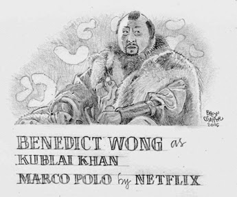 Did you see the Netflix mini-series, Marco Polo? I enjoy sketching characters from costume dramas with elaborate, ornate costumes. Kublai Khan, played by Benedict Wong, was such a character. His costume was among the most complex and detailed that I have seen in any film. Unfortunately, 72 dots per inch doesn't translate well onto the screen. Much of the detail is lost. But Wong's character was fun to sketch.