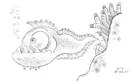 The is a sketch of a sea creature for an online game I was working on a couple years ago. It's obvious that he needs some orthodontic correction for that severe under-bite.