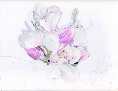 I've begun to add the color to my Discovery Bay Rhododendron colored pencil painting. To some extent it's not ready for the public to see yet because at this stage of the painting the colors of the flower are so high-key that there's very little contrast between the flowers and the background. The contrast will dramatically change the painting as I add in the dark background information.