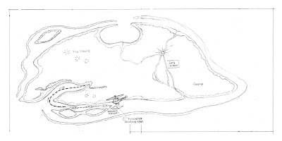 You'll note a pencil line running around the island inside the lagoon as well as over the land area, showing directional arrows. This will be the track that the expedition follows. You'll note the helicopter in the lower center. That's the drop-off point, where the expedition begins. The first portion of the expedition as it tracks into Hooloo Cove is indicated by the dotted line. The next time you see this sketch, the course of the expedition will all be drawn in dotted line. (Enlarge above image for a closer look.)