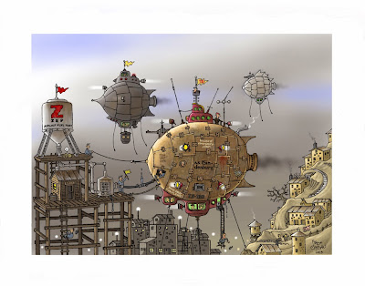 | I'm finally on the home stretch with the ink line on my Airship Refueling painting. I'll be painting soon. It always amazes me what a huge leap there is between the ink line and the finished color because of the contrast and depth that the color brings. My first decision was whether to paint it without an ink line or leave out the line. I've gone both ways many times. Of course the ink line won't look so strong when the color is in. The highest values and hues will be with the airship and the fueling port. The dwellings on the hillside will be rather monochromatic and muted. The sky will be obscured by a heavy industrial smoke, throwing the background airships into a low monochromatic value. The lights on the airships penetrating the smokey fog should provide a dramatic effect, as will as an unseen light out-of-frame on the left. There may be a hint of blue sky in the upper right portion of the frame. This is what's in my head...we'll see what lands on the "canvas". I'm still up in the air (pardon the pun) about what sort of building I will draw under the airship, in the bottom center of the frame. Also what to put on the refueling tank on the left side, a name or logo of some kind. I had originally lettered "Sub Standard Oil" in the pencil layout, but I think I've abandoned that idea. Any suggestions would be welcome. Have you seen my other blog, The Trowbridge Chronicles? Check it out here. |